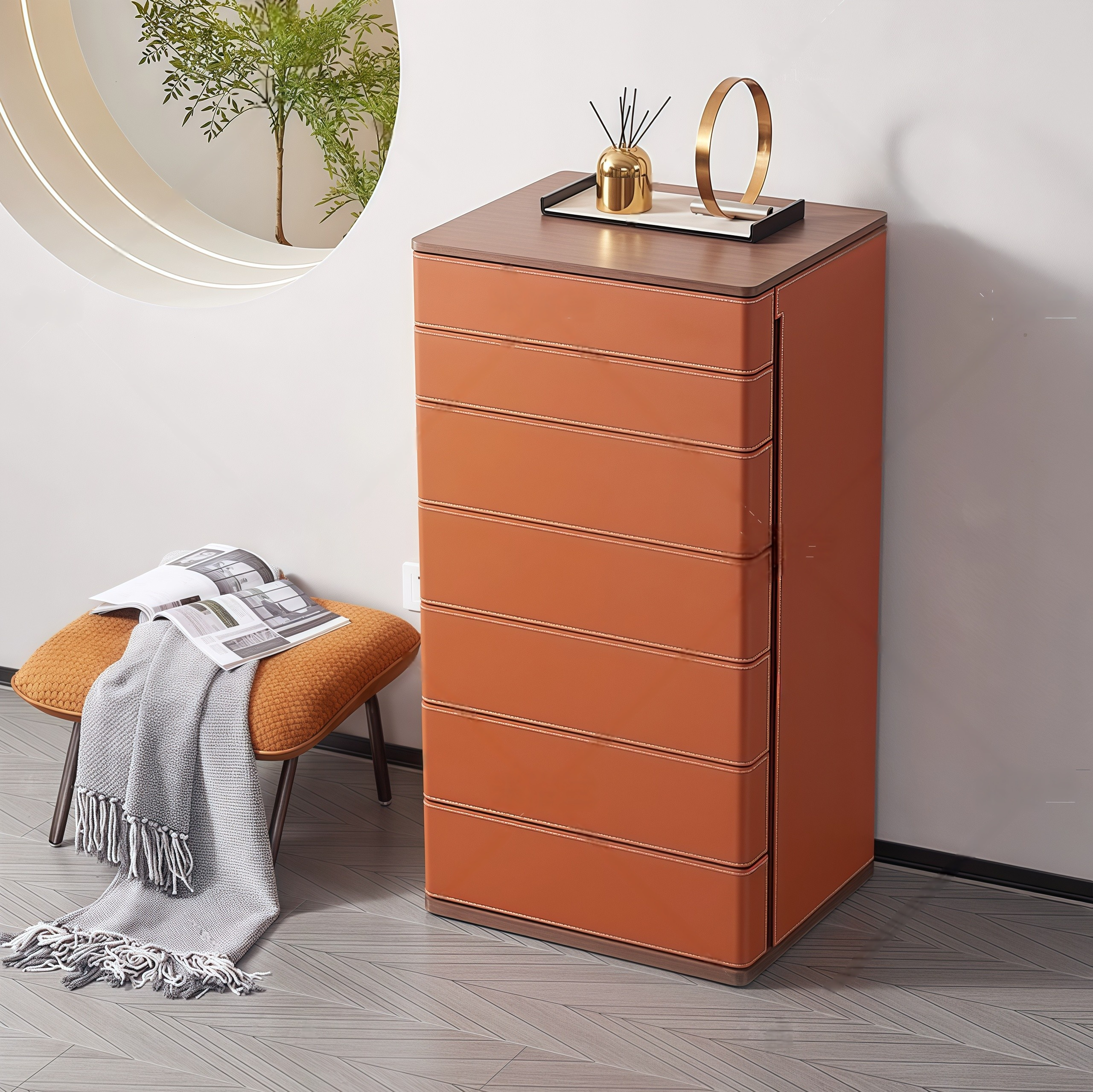 - Dimensional Contrast: Horizontal leather stitching echoes the herringbone-patterned flooring in suggested room settings.
