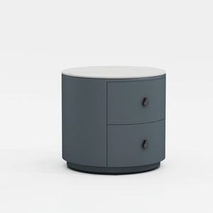 Round Nightstand - Gray Leather Dresser with Marble Surface & Metal Knobs"Keywords